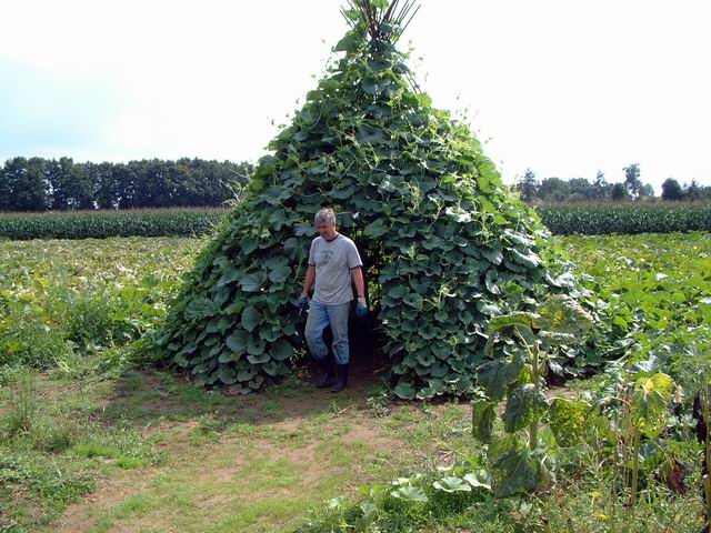 Übrigens, eine kleine Attraktion bildet der große Wigwam aus Kalebassenpflanzen, der jährlich zum Ende August zu bewundern ist.